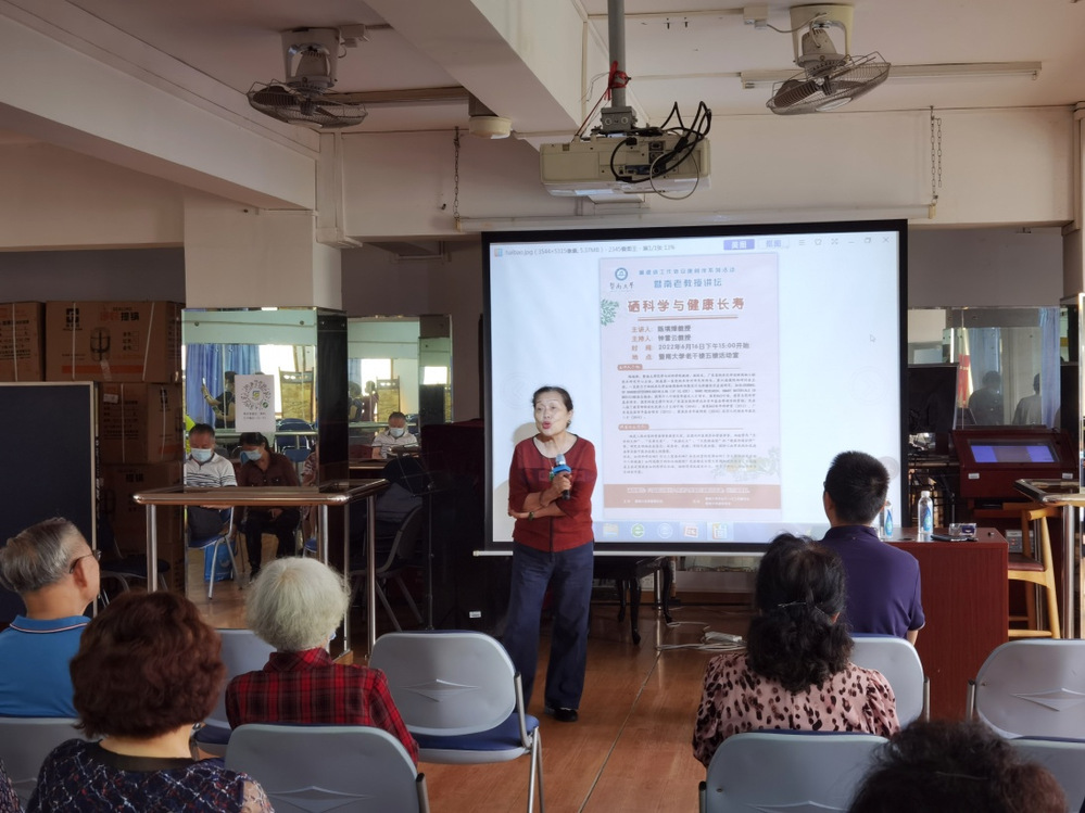 2022年6月16日下午,“暨南老教授讲坛”大健康知识和科普知识讲座第七讲--《硒科学与健康长寿》在学校老干楼五楼会议室举行。本场讲座由教育部新世纪优秀人才支持计划、国家863青年科学家、广东省杰出青年基金项目、霍英东青年教师奖及万人计划青年拔尖人才、暨南大学暨南大学化学与材料学院教授、副院长,广东省纳米化学创新药物工程技术研究中心主任,附属第一医院纳米诊疗研究所所长、第六届国际硒研讨会主席陈填烽教授主讲,由老教授协会医药专业委员会副主任、暨南大学医学院钟雪云教授主持。